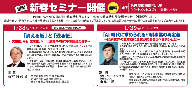 イベント情報 TOP イベント情報 印刷機材の総合展示会 PrintDoors2026第62回新春機材展 開催!! 2026年1月28日(水)10:00~17:00・29日(木)9:00〜16:00 名古屋市国際展示場ポートメッセなごや3号館 お名刺1枚でご入場いただけます。